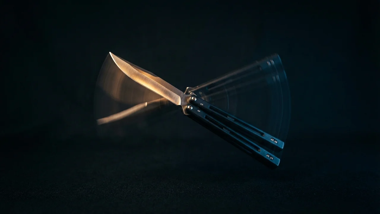 Lightweight titanium-lined butterfly knife with a razor-sharp D2 steel blade.